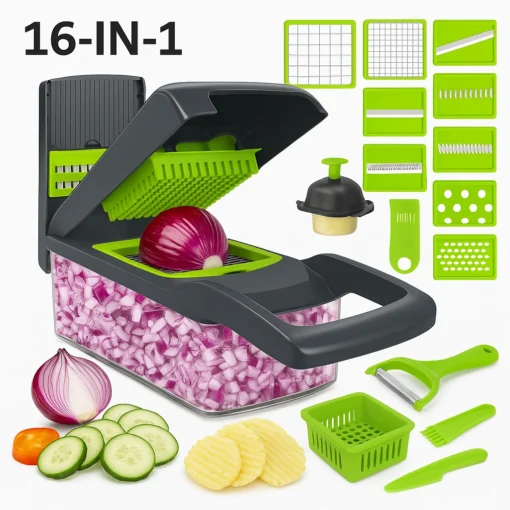 استمتعي بتحضير الطعام بسهولة واحترافية مع قطاعة الخضار الجبّارة 16 في 1 – الحل الأمثل لكل سيدة تبحث عن السرعة والتنظيم في المطبخ!