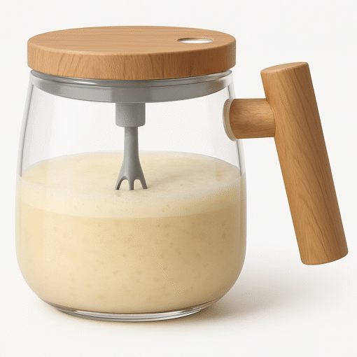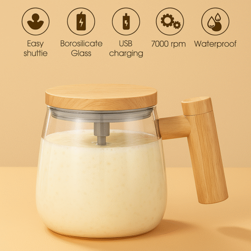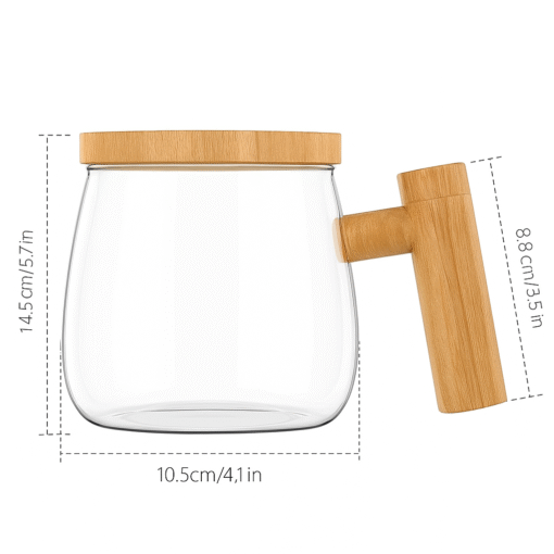 مج خلاط زجاج 400 مل بيد خشبية أنيق وعصري، يعمل بوصلة USB ويتميز بخاصية التحريك الذاتي لتحضير القهوة، البروتين، والشوفان بسهولة. تصميم عملي بمواد عالية الجودة، مثالي للاستخدام اليومي والسفر.